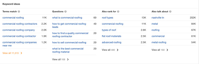 Search Engine Optimization or SEO for short is the process of building content out on your site to attract more searches for specific searches – making technical changes, and getting links (huge for Google visibility.) Now – what are people searching related to Commercial Roofing?