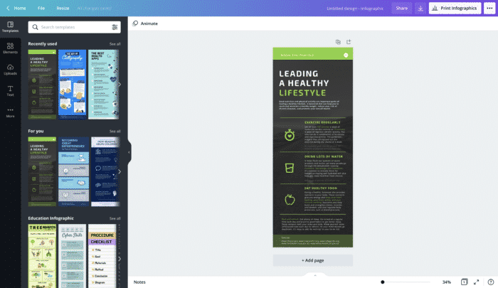 Canva is a wonderful resource that offers users 100s of different infographic templates to choose from! They have plenty of different fonts, graphics, and photos to help you enhance your design as well. Canva is a fan favorite resource to use when