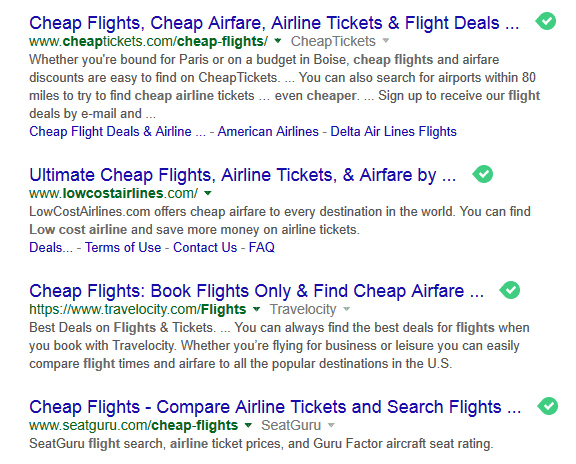 When you search for “Cheap Airline” you’ll see that Google will bold the keywords that match your search terms. The word airline is a synonym to flight that you can use instead. When you’re reaching your limit on how many times you can use your target keywords, start to use in synonyms instead. You’ll get the ranking benefits while avoiding over-optimization.
