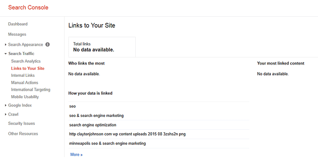 From the main dashboard of Search Console click on “Search Traffic” and then “Links to Your Site”