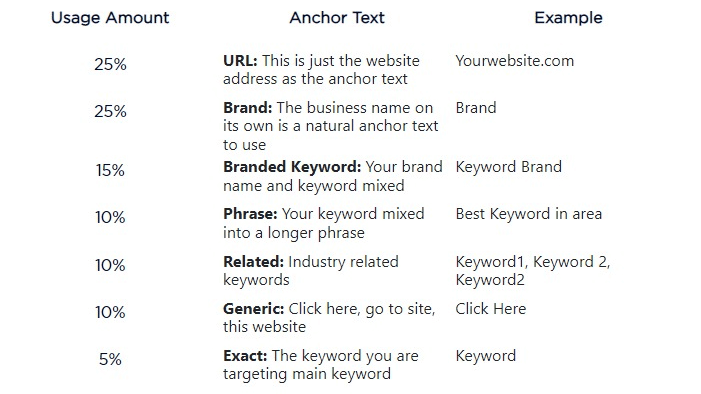 Having a variety of anchors keeps your link profile natural. Use this chart as a loose guideline to follow when you are getting links to your site.