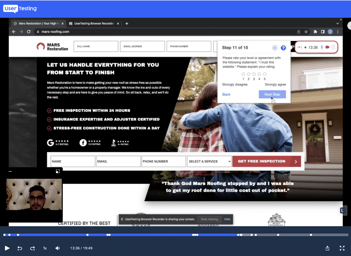 We administered 4 tests to random users, all who were homeowners. The site we used was Mars Roofing All of the participants from this round of testing were able to successfully complete the direct task(filling out the form to get in touch) but we found that open-ended tasks yielded more organic observations from our follow-up questions.