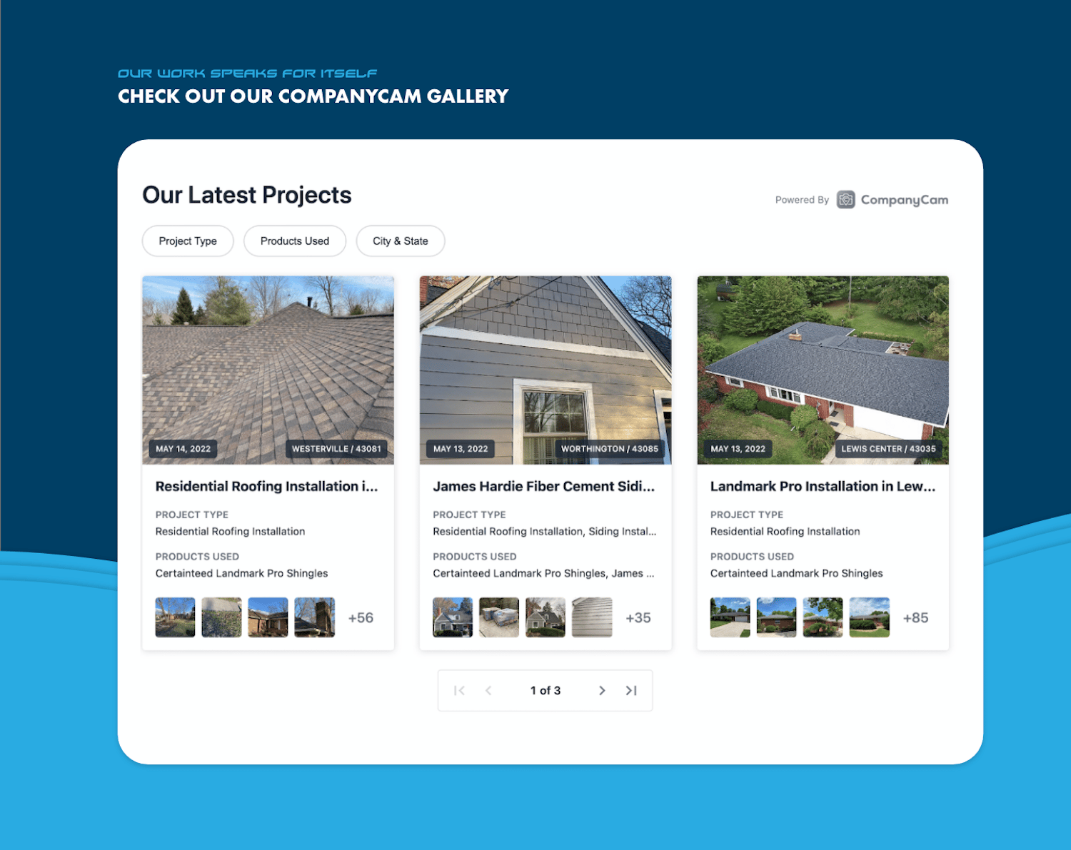 CompanyCam takes away the hassle of fumbling around the backend of your website to try and enter in recent project photos. Once your Showcase is embedded on your site, things will automatically sync as you enter more projects on CompanyCam. How cool!