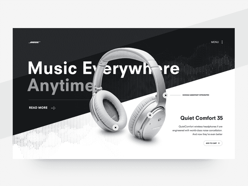 The idea of a more minimalist approach to web design is that the few things you leave behind when subtracting are only the absolute most important elements that will bring the composition together. In this case, there are more stylized elements behind the products – these design elements go upwards and at an angle to draw the viewer’s eye along the page, and the circular parts give a cohesive feel to the page with the circular products in the foreground.