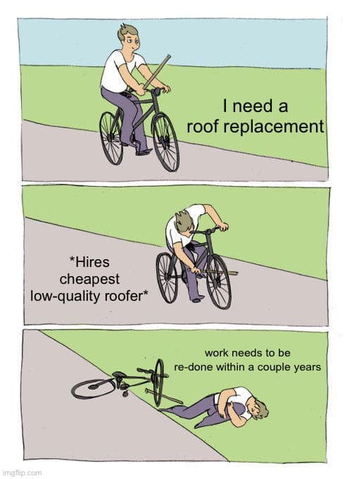 Sometimes we just need that time in life to laugh at something funny and take a break from all the responsibilities we have in life. Memes are such a great way for us to laugh at ourselves and not take everything so seriously. Hopefully, this was a nice treat for the roofers out there to get a kick out of. Stay safe and keep working hard!